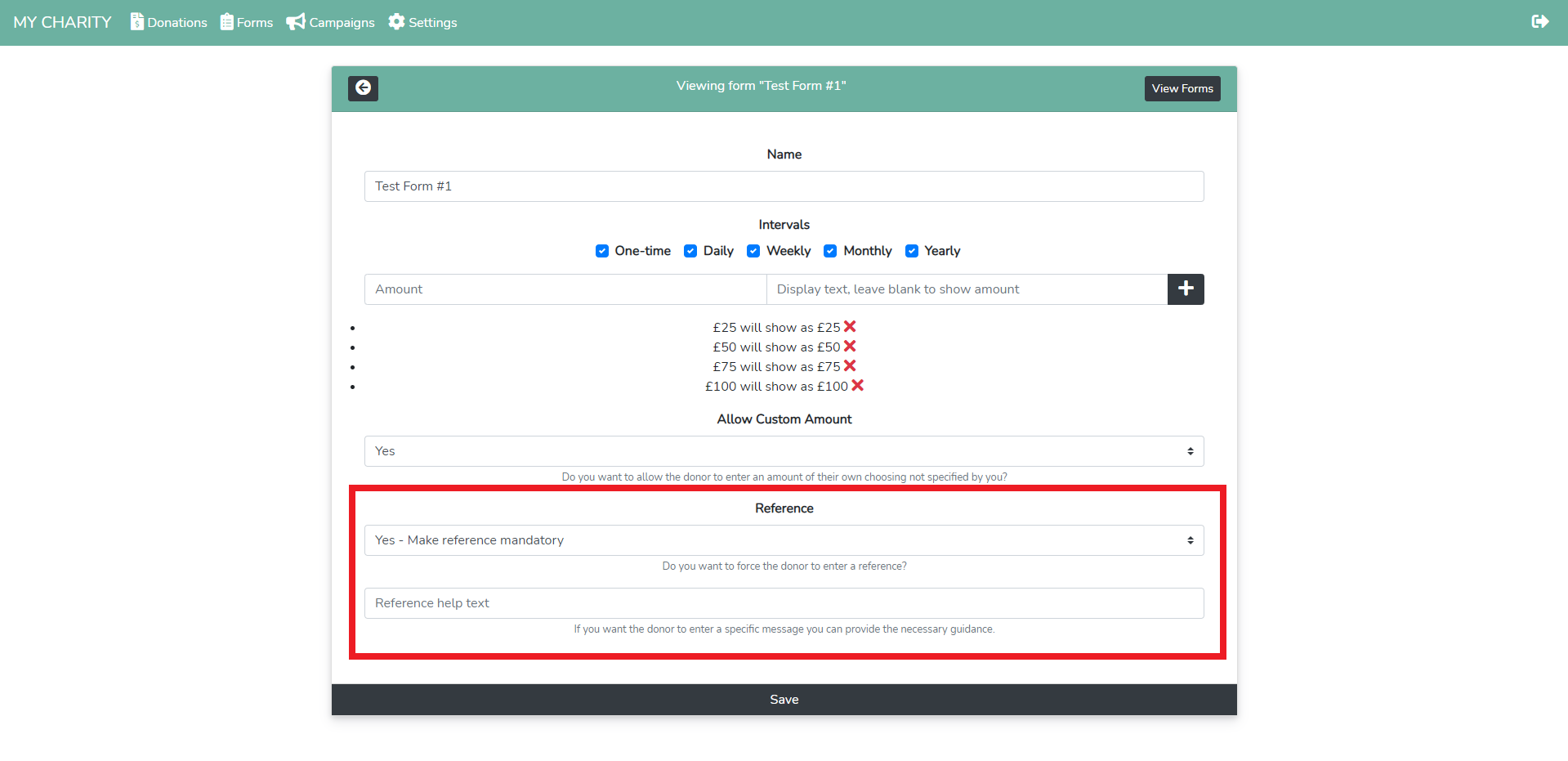 The dropdown will allow you to enforce the donor to enter a reference. By default, entering the reference is not forced.